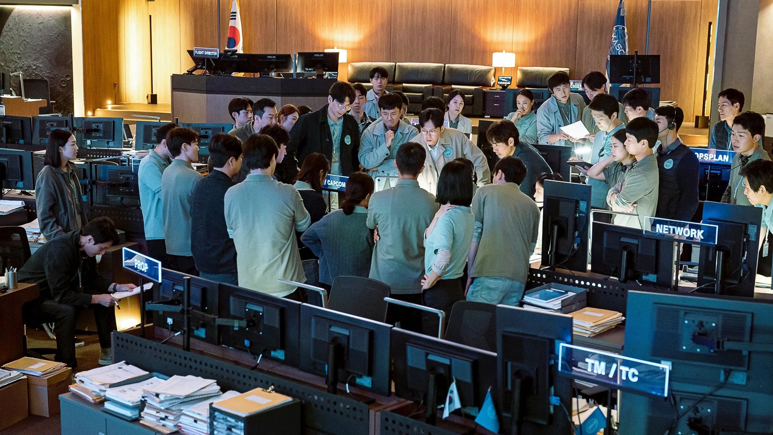 Die Regie bevorzugt Lesbarkeit. Kim Yong-hwa blockiert die Missionskontrolle wie ein lebendiges Instrumentenbrett – wer wo steht, wer was übergibt und wie Informationen fließen. Die Sequenzen im Weltraum bleiben lesbar: Wir verstehen, was ein Hebel tut, was eine Anzeige bedeutet und warum ein Fehler von fünf Grad katastrophal ist. Klarheit wird zu einem eigenen besonderen Effekt.